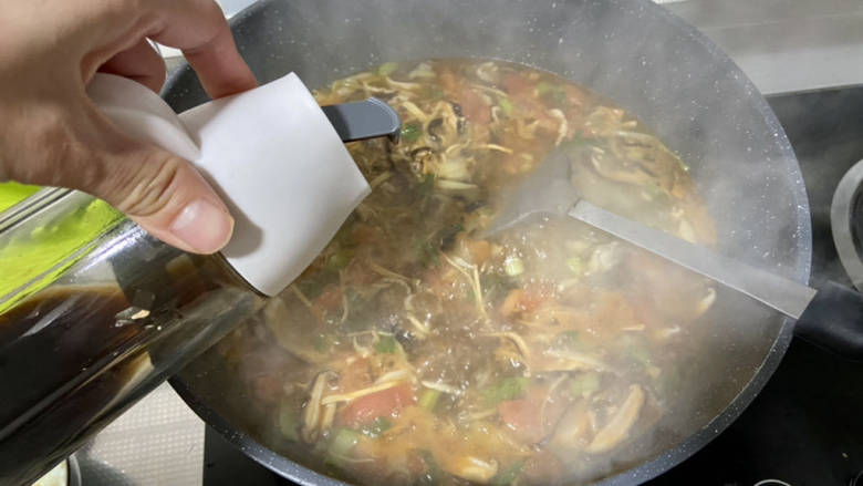 21. 转中大火,淋入半汤勺水淀粉搅拌,煮到汤汁浓郁
