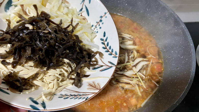 16. 加入木耳,香菇,豆皮,笋丝,葱白丝,姜丝煮开