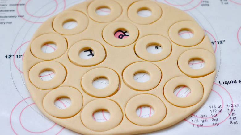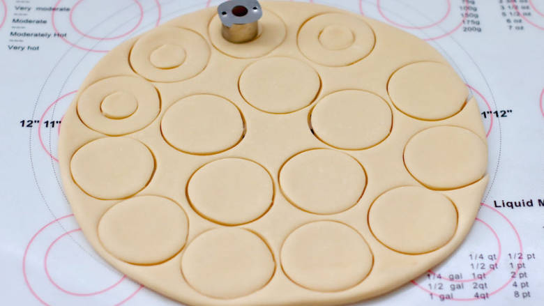 7. 每次剩下的边角料再反复擀薄压出大圆和小圆。