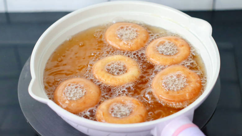 9. 锅中倒入适量油,烧至七成热,放入个小面团可以起泡飘上来的时候,把甜甜圈面胚放入油锅中。