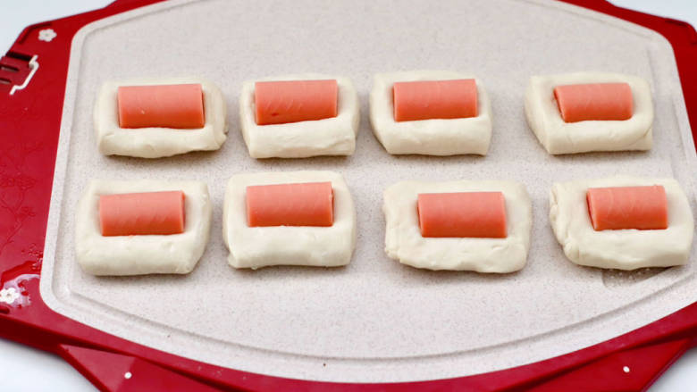 6. 火腿肠切小段改一下刀,按压在手抓饼中间。