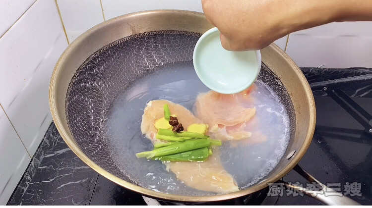 5. 煮熟的鸡胸肉拿出晾凉撕成小条