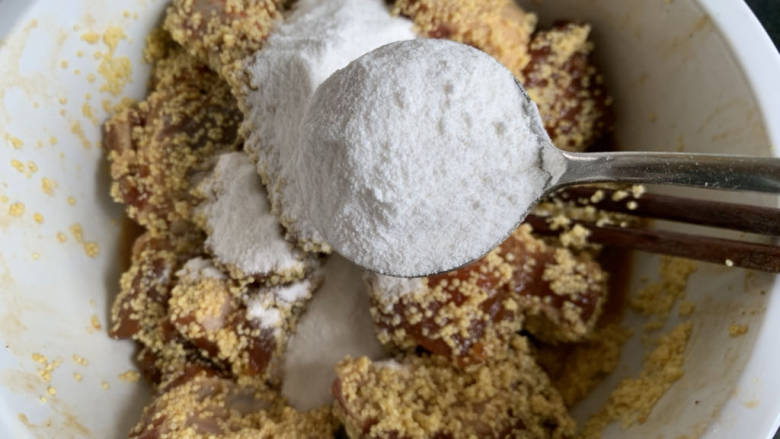 9. 全部放入,搅拌均匀,使排骨都裹上小米