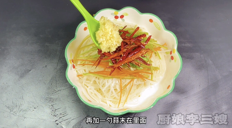 11. 用热油浇一下激发出辣椒的香味并加入盐味抓拌均匀