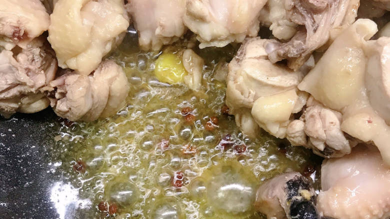 5. 锅中放油烧热,放入姜片炒出香味再放入花椒粒草香
