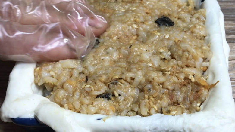 11. 将手抓饼周边向米饭盖压,包裹严实