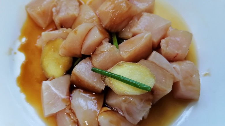 6. 放入姜片好葱段将鸡胸肉腌制十五分钟