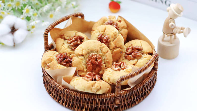 9. 每个桃酥胚按压一个核桃仁。