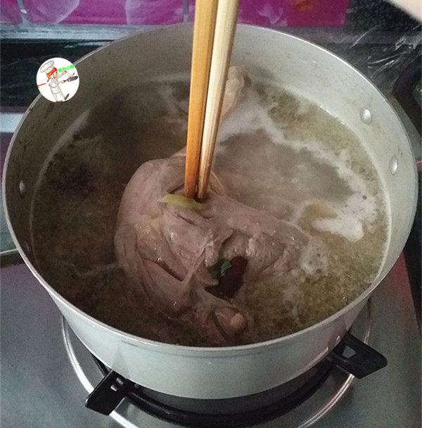 7. 煮开后放入晾干的腌鸭腿,水量盖过鸭腿,加盖大火