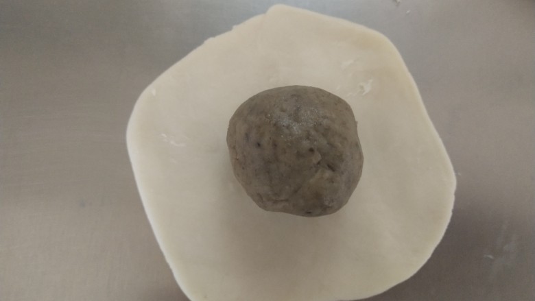 5. 取一个油皮,用手弄成圆形,包入油酥,封口包紧。