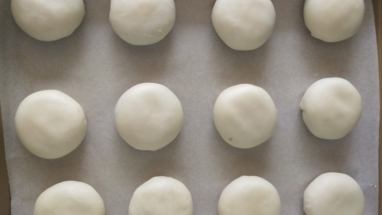 11. 趁空隙时间,把绿豆沙分成每个28克左右,揉圆。