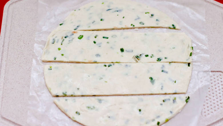 2. 取一张葱香手抓饼,切成和培根一样的宽度。