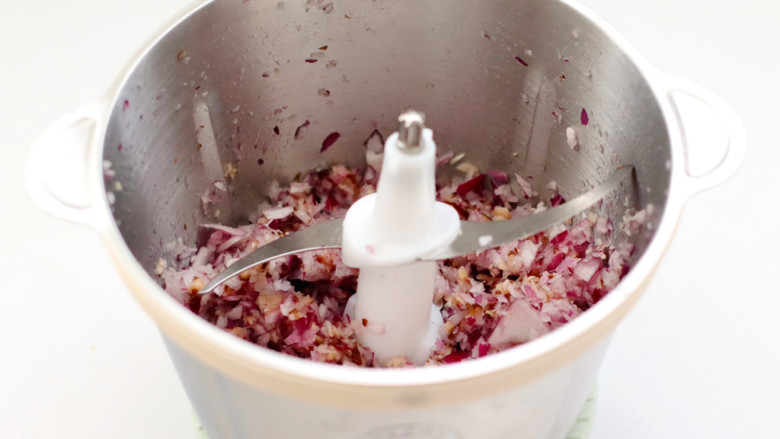 4. 打开绞菜机开关开始碎菜(双档调速、300W强大电机、秒速绞碎,搅打效果随意切换)