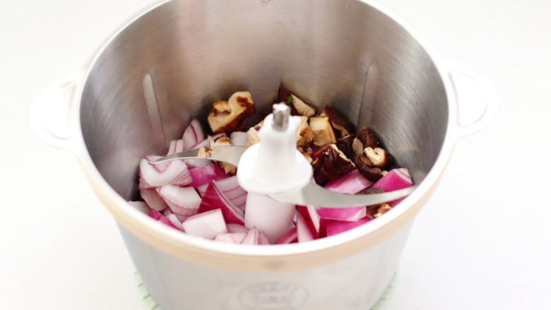 2. 洋葱去外皮洗净切丁,香菇提前泡发后洗净去蒂切丁,放入我新入的九阳叠叠【發】绞肉机的绞菜桶里。