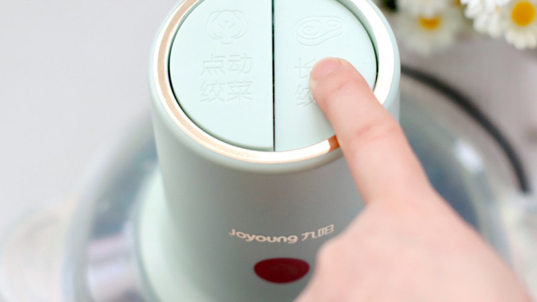7. 启动绞肉模式开始绞肉(短轴四叶斜刀,不易塞肉易清洗,特设杯盖刹车结构,开盖即停免伤手)