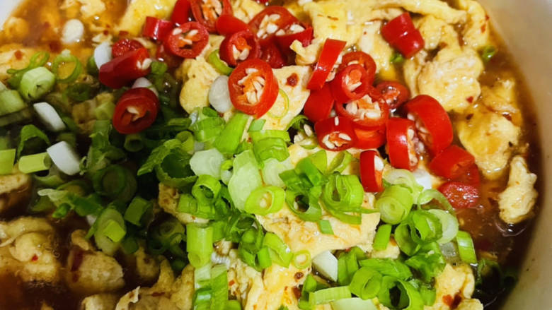 6. 鸡蛋打散,炒好后倒入调好的酱料。