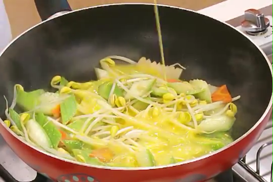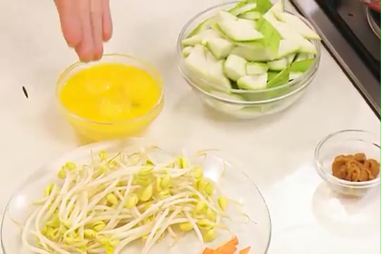 5. 再加入黃豆芽續煮2分鐘後,放入打散的蛋液,拌炒至蛋液熟成即可