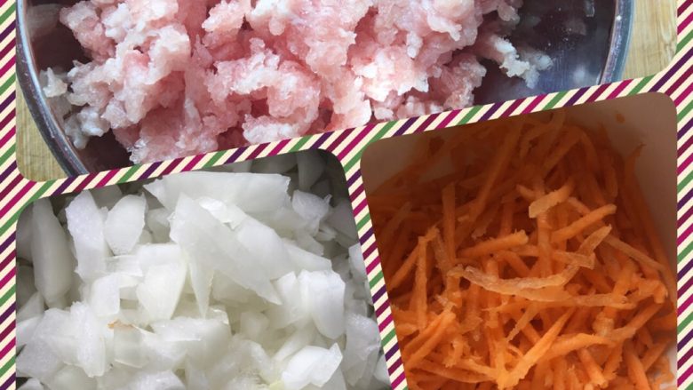 3. 煮通心粉的时候可以来准备配料,肉末,半个元葱切碎,胡萝卜切丝,配料的量主要是比着通心粉的量来决定的