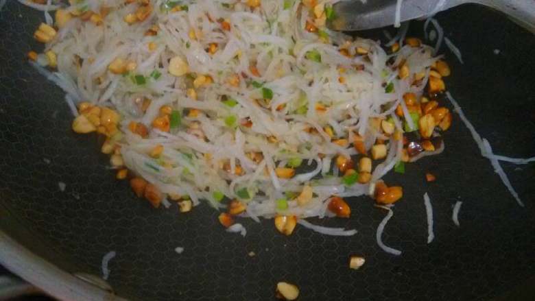 6. 另起锅热点油,把面糊倒进去,不要搅拌先。