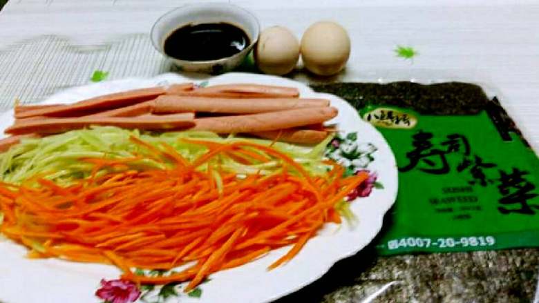 紫菜包饭是小朋友爱吃的食品,我家小朋友天天叫我包给她吃,我嫌麻烦借口上班忙推脱,昨天下午她又说了,哎做吧给她当早餐。