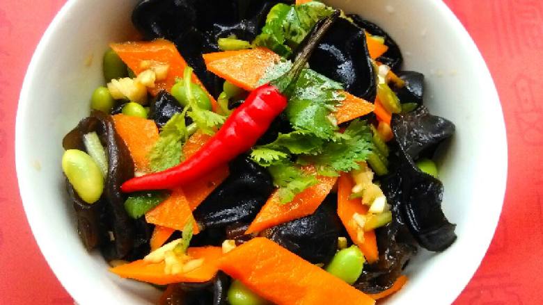 5. 将云耳拧干放入碗里加蒜头、盐、香醋、酱油、香菜
