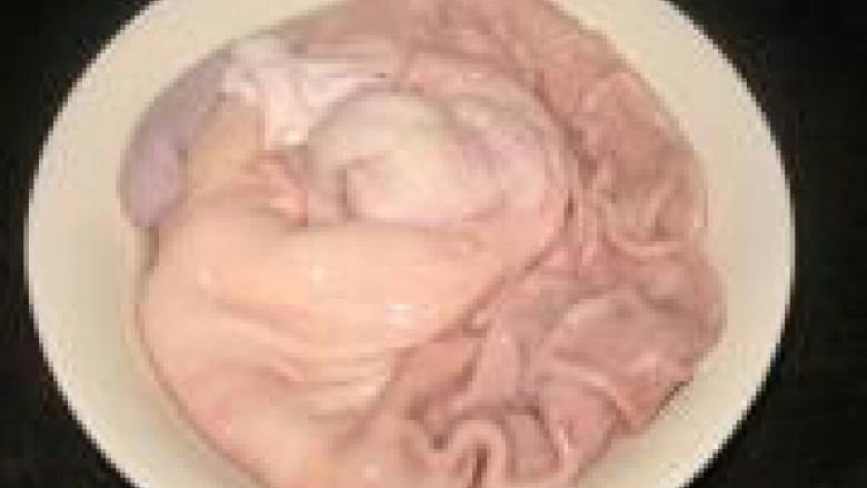 1. 将猪肚翻过来反复用盐和生粉搓揉,清洗干净它的粘液。