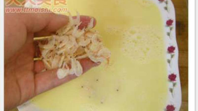 5. 将虾米均匀的散布在蛋液上,再将其放入锅内盖上锅盖,大火蒸十分钟,至蛋液凝结即可。