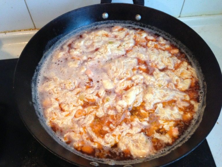 4. 锅内烧热放油,建议多加油,油热后放入剥下的虾头炸出虾油,放葱花,炒香后放入另一半虾段炒至变色,这时加入煮开的虾皮水,虾皮丢掉,水开后打入加鸡蛋的虾段,加盐调味即可。最后放点韭菜提味。