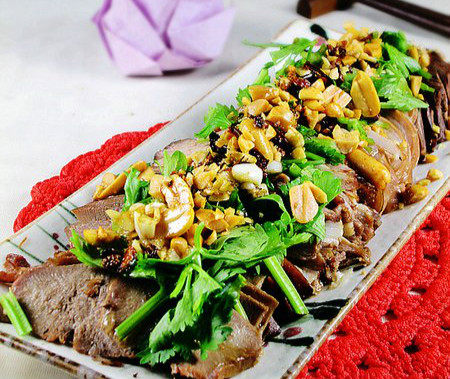 9. 将切好肉片加入香菜和嫩芹菜段,撒上香酥花生碎,浇上麻辣汁搅拌均匀即可