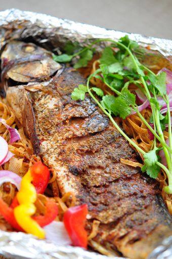 5. 烤好一面的鱼翻面后同样撒孜然、花椒、辣椒粉、橄榄油烤至金黄
