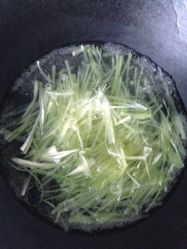 2. 如图将莴笋丝过热锅3分钟。