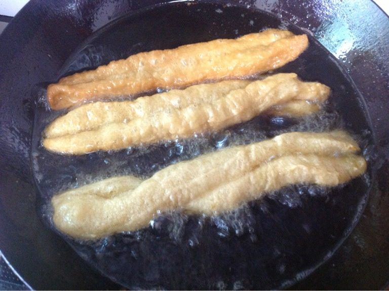 11. 油锅要热,油条胚的两头用手捏紧防散开,油条胚拉长后投油锅炸,用筷子翻转,让油条受热均匀膨胀发起来