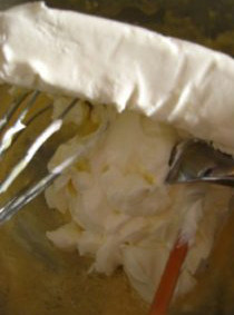 4. 分次加入鸡蛋液,搅成奶酪糊,倒入饼胚