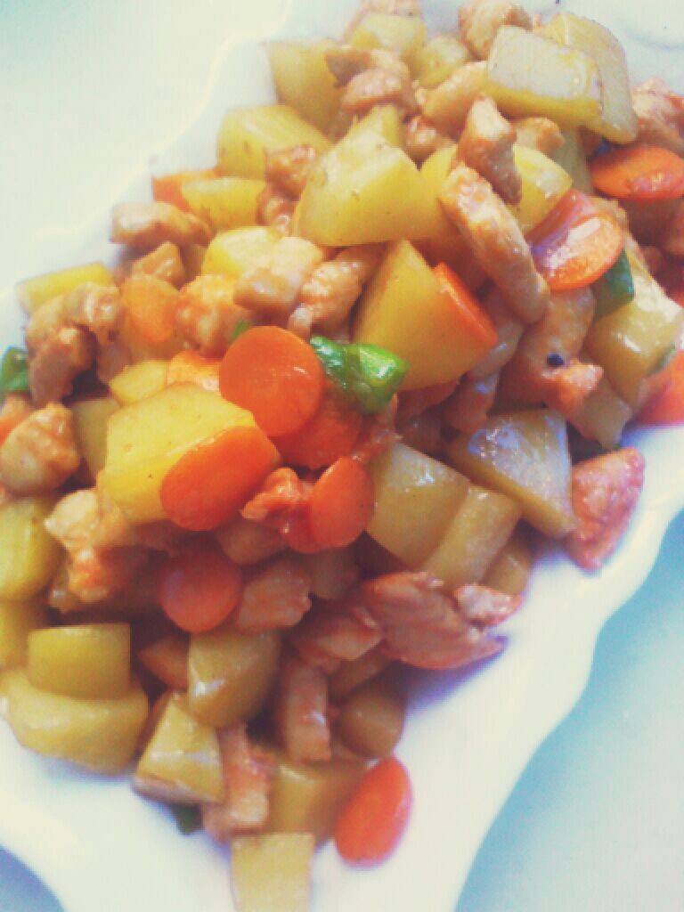 4. 收汁倒入青椒。胡萝卜丁翻炒。
