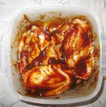 2. 将黑胡椒酱放入,用手给鸡翅按摩2分钟,使鸡翅均匀的裹上酱汁