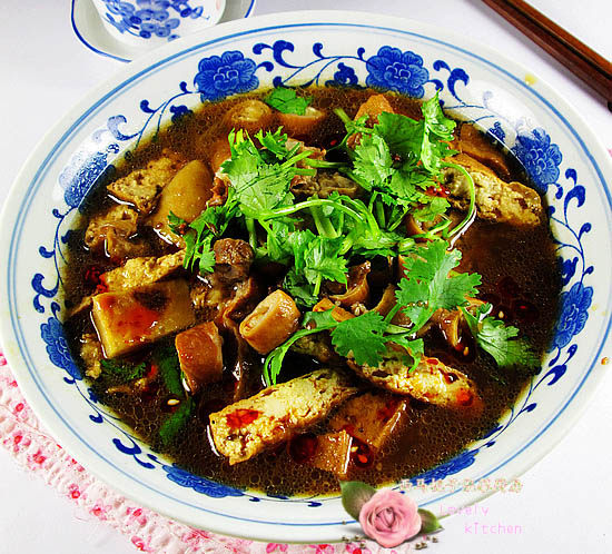 18. 把煮烂的肠子 切成小段,猪肺切成片,火烧切井字刀, 炸豆腐切成片