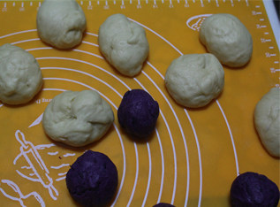 8. 发酵好的面团取出排气,分成小份,紫薯泥也分成小份