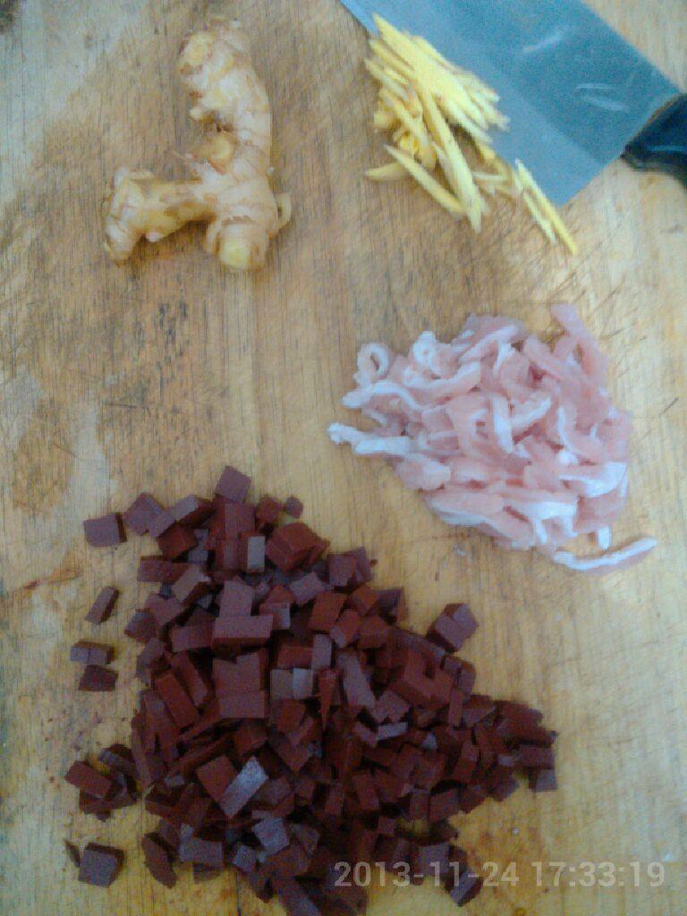 2. 把姜丝,猪血,肉筋(瘦肉)切成如图。