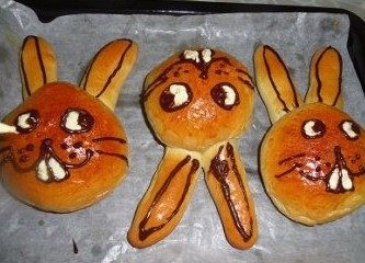 11. 将裱花袋剪开一点,在冷却下来的面包上挤上兔子模样