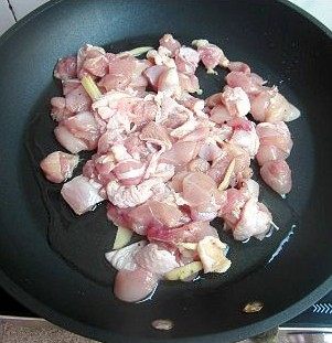 2. 平底锅放入适量的油,烧热后放入鸡丁滑炒至鸡丁变色后捞出