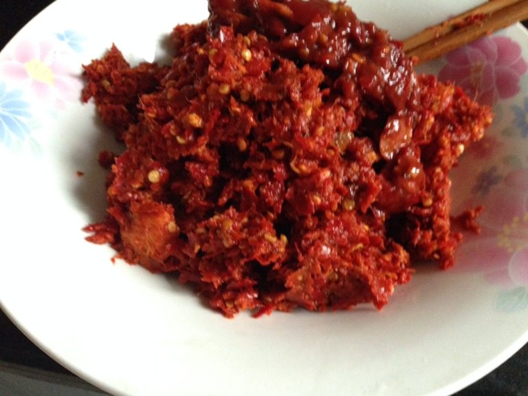 1. 首先准备这样的辣椒,贵州的特 色辣椒,可在网上买,也可自己制作。适量的干辣椒用热水泡半个小时,加大蒜、姜一起捣碎。