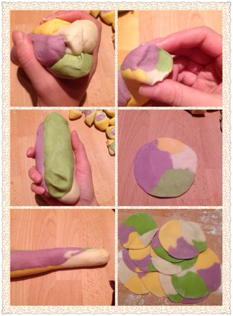 2. 三种汁水分别加入三份面粉里,和成紫、黄、绿三种颜色的面团,原色的面团只加水。把面团用保鲜膜包起来,饧半小时。(和面的时候一定注意水份要“多次少量”慢慢加。)