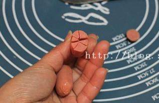 8. 取脆皮肠,一头切掉一点,然后“米”字刀切开,注意留1厘米左右,不要切断