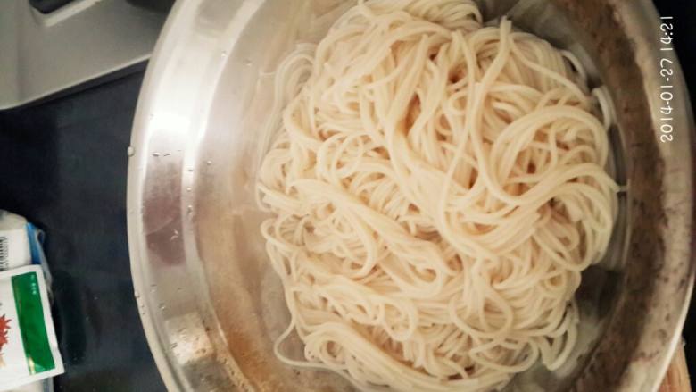 2. 面条用清水煮2至3分钟即熟。(最笨最简单的办法就是把煮好的一根面条甩到墙上,它不会掉下来,说明已经熟了)。盛出备用。