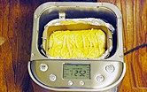 9. 面包桶外包上锡纸,放入面包机内,选择烘烤模式,烧色浅50分钟+烧色中10分钟即可