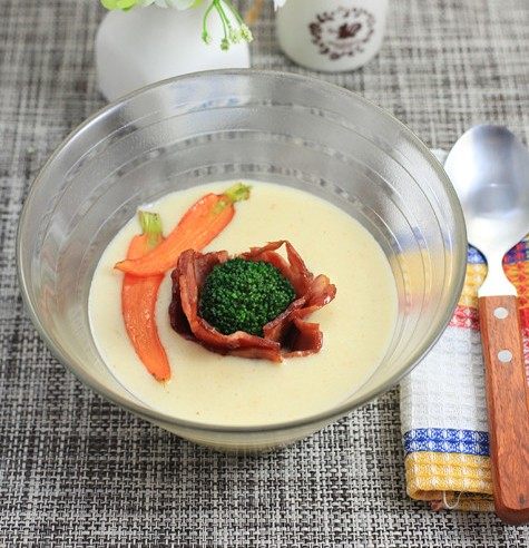 - 培根、胡萝卜、西兰花烤好后切切碎,撒在土豆奶油浓汤上,吃前拌拌匀。