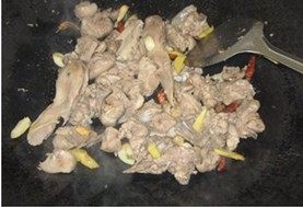 3. 炒锅下油,放入姜蒜片及干辣椒段煸香,倒入鸭肉爆炒均匀