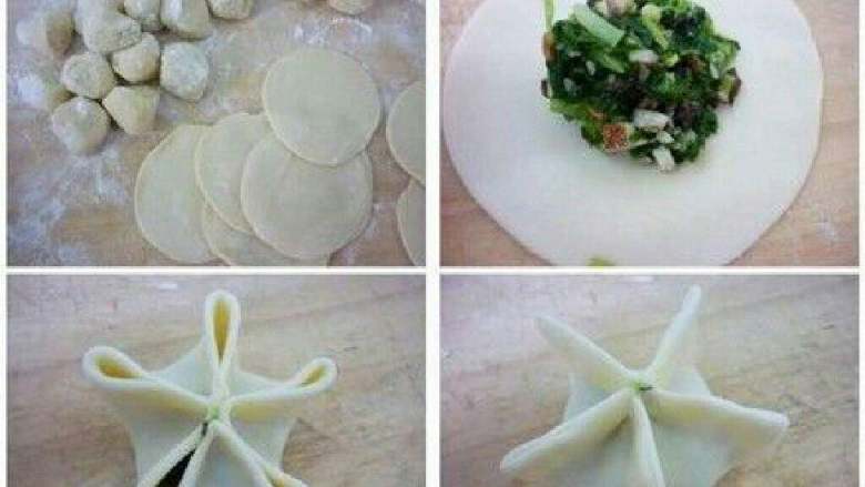 3. 把面团搓条,下剂子擀皮,包入馅心。把圆皮均分5点,粘在一起形成5条边,把口捏紧。