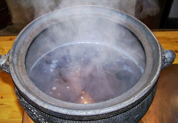 3. 取4克金桂花放入大茶碗冲入80度热水,浸泡出香后将水泌入砂锅,重复冲泡5次,将所有茶水倒入砂锅,再将砂锅内的水加足,大火煮开