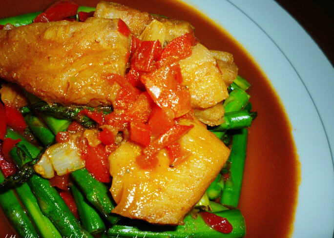 1. 比目鱼切块,大红椒半个 切丁,芦笋6根 切条